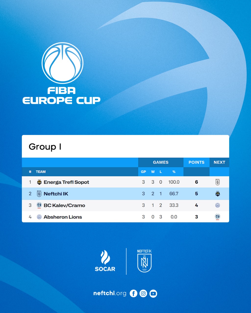 “Neftchi” basketball team, which is in Group I of the main stage of the FIBA ​​Europe Cup, continues its successful performance. Having won two of the three games it has played so far and lost one, our representative is currently in the second place in the tournament table with 5 points.